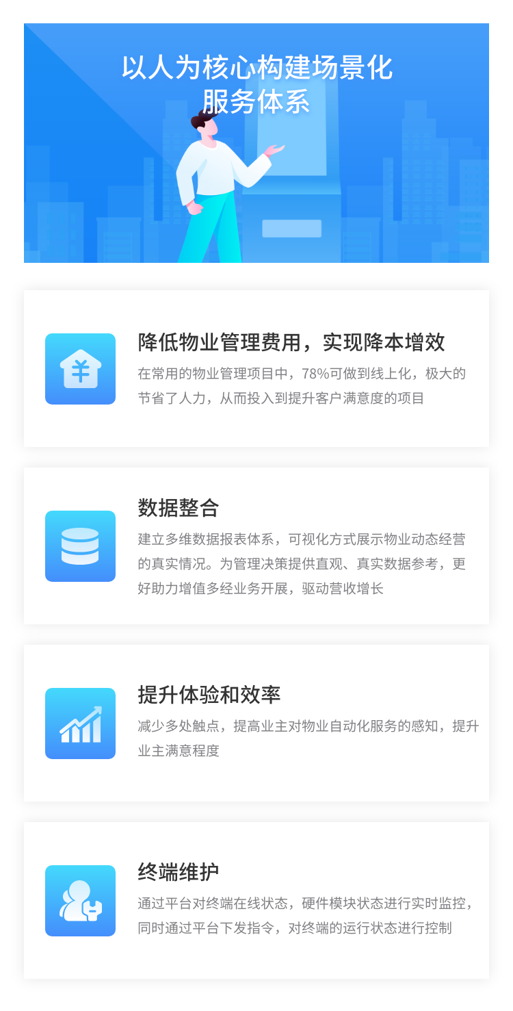 證通智慧物業(yè)解決方系統(tǒng)是公司為物業(yè)機(jī)構(gòu)客戶提供的定制綜合一體化解決方案。通過與物業(yè)公司內(nèi)部統(tǒng)一化管理系統(tǒng)進(jìn)行對(duì)接,集成刷臉支付、微信、支付寶、銀行卡等多種繳費(fèi)支付渠道,支持客戶使用人臉識(shí)別、身份證、指紋等進(jìn)行身份確認(rèn),提供資產(chǎn)委托、影像信息記錄、證件打印、住戶信息管理、物業(yè)繳費(fèi)、繳納記錄查詢、設(shè)備狀態(tài)監(jiān)控、終端信息維護(hù)、人工客服,消息推送、房屋過戶、車位過戶、便民物資領(lǐng)借用,證明開具、文化宣傳、報(bào)表統(tǒng)計(jì)等全流程物業(yè)增值服務(wù),讓數(shù)據(jù)多跑路,讓業(yè)主少跑路,實(shí)現(xiàn)物業(yè)費(fèi)輕松繳、業(yè)主零等待、安全居住的物業(yè)服務(wù),實(shí)現(xiàn)線上和線下的有效互動(dòng)合作。