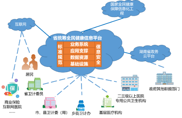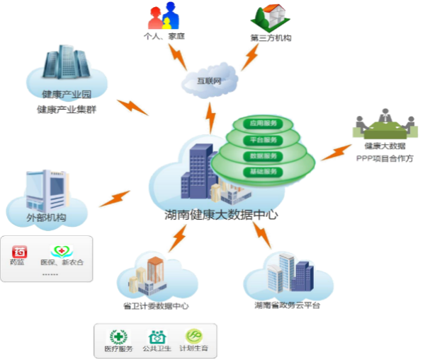 湖南健康大數(shù)據(jù)中心建設(shè),一方面通過(guò)政策配套支持,與湖南省衛(wèi)生健康委省級(jí)數(shù)據(jù)中心、湖南省政務(wù)云平臺(tái)以及相關(guān)外部單位對(duì)接,在政策許可、授權(quán)監(jiān)管下,使用現(xiàn)有信息化成果與醫(yī)療衛(wèi)生服務(wù)資源;另一方面,通過(guò)引入具有豐富經(jīng)驗(yàn)的醫(yī)療健康項(xiàng)目合作單位,基于健康大數(shù)據(jù)云平臺(tái),建設(shè)“醫(yī)療健康+互聯(lián)網(wǎng)”應(yīng)用,并面向個(gè)人、家庭、第三方機(jī)構(gòu)開(kāi)展運(yùn)營(yíng)工作,開(kāi)展健康大數(shù)據(jù)應(yīng)用,培育醫(yī)療健康服務(wù)產(chǎn)業(yè)。