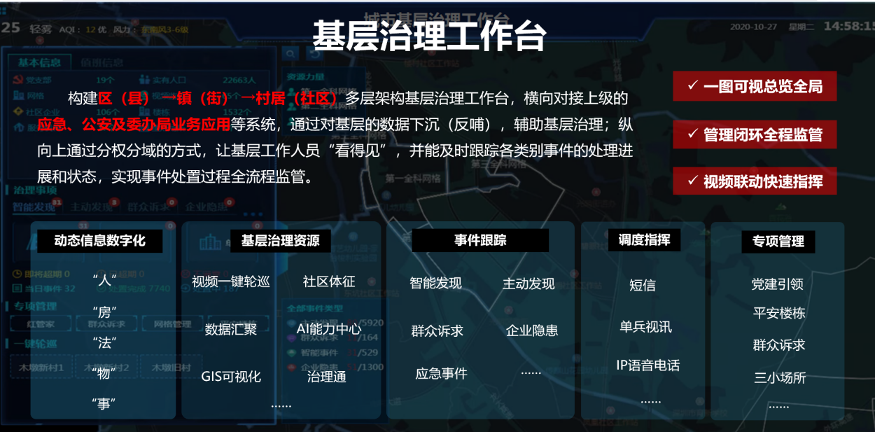 為貫徹習(xí)總書記“把更多更好的資源、服務(wù)、管理下沉到社區(qū)”的基層治理指導(dǎo)方針,充分利用智慧城市已建基礎(chǔ)設(shè)施,通過整合資源、數(shù)據(jù)共享為基層治理管理人員、網(wǎng)格員、平安員等提供日常信息化管理工具。聚焦治安、治理、服務(wù)三大領(lǐng)域,通過數(shù)據(jù)下沉、全事件跟蹤、資源力量實時調(diào)度等手段,用數(shù)據(jù)把人、制度、服務(wù)、管理要求連接起來,真正支撐基層的管理工作,實現(xiàn)精細化治理和精準服務(wù),全面提升社區(qū)的治理與服務(wù)現(xiàn)代化水平。