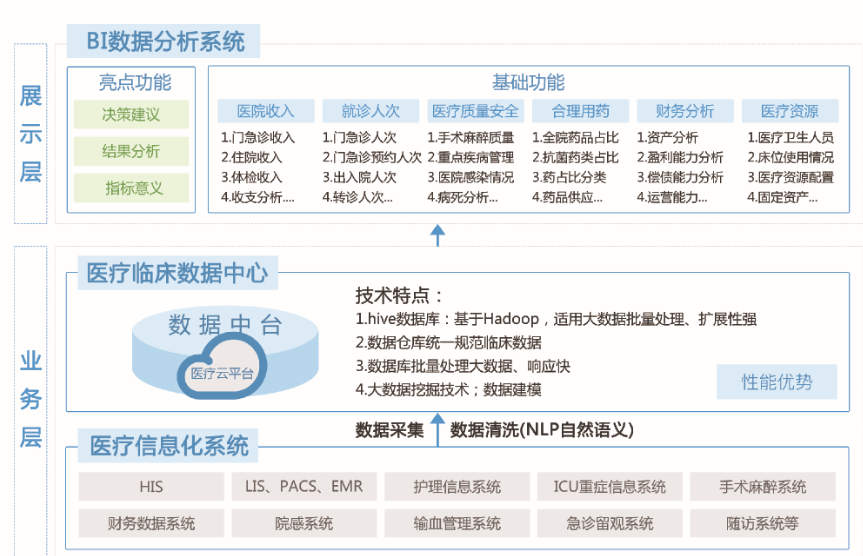 由于醫(yī)院現(xiàn)有業(yè)務(wù)系統(tǒng)的數(shù)據(jù)無法統(tǒng)一整合與分析,并無法為醫(yī)院領(lǐng)導及各級管理者提供經(jīng)營管理決策的依據(jù)。醫(yī)療大數(shù)據(jù)解決方案致力于利用hadoop大數(shù)據(jù)挖掘、數(shù)據(jù)倉庫和OLAP多維分析等技術(shù),通過門急癥服務(wù)、住院服務(wù)、用藥管理、手術(shù)麻醉、醫(yī)療資源、財務(wù)統(tǒng)計等方面功能的接入和完善,整合/分析醫(yī)院業(yè)務(wù)信息系統(tǒng)的業(yè)務(wù)數(shù)據(jù),建立統(tǒng)一的用于醫(yī)院運營管理與科學研究的可視化指標分析管理體系。