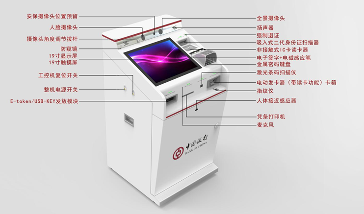 本產品采用簡潔、明亮的設計風格,對各功能區加以區分,整機尺寸采用最小原則,設計緊湊,良好的人機交互操作,具有友好、可信、安全、科技的綜合應用屬性。機身上設有全景攝像頭,集激光條碼掃描,二代身份證、指紋掃描,電子簽名、電動發卡讀卡等功能于一體,切實根據用戶的需要訂制帶有不同功能的機器。