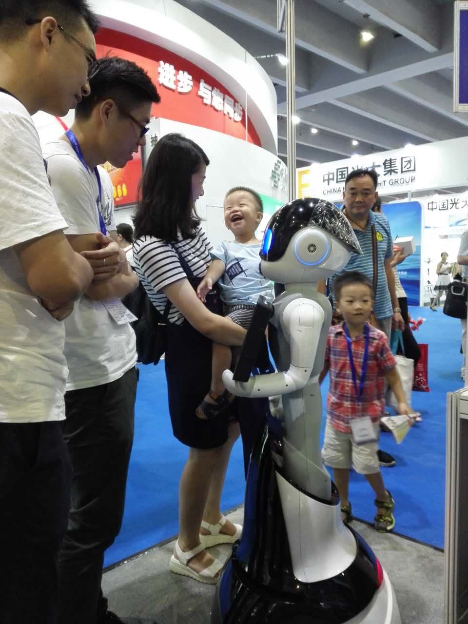 展會(huì)現(xiàn)場,不知誰家的小萌娃被FINBOT逗得直樂呵。