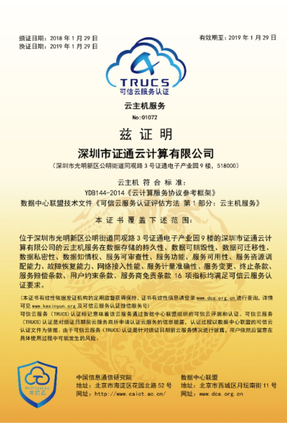 2018年2月1日,中國信息通信研究院正式發(fā)布了2017年下半年第九批通過可信云認證的名單。證通云主機服務順利通過可信云云主機服務認證。