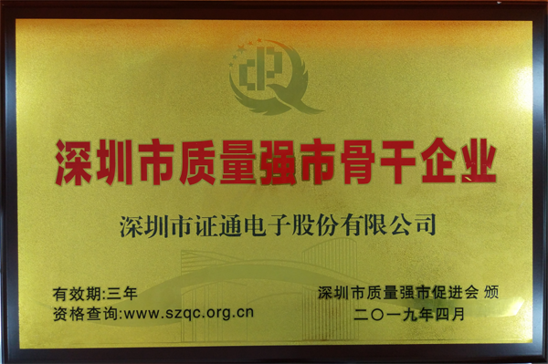 2019年4月28日下午,由深圳市質(zhì)量強(qiáng)市工作領(lǐng)導(dǎo)小組辦公室指導(dǎo),市質(zhì)量強(qiáng)市促進(jìn)會(huì)主辦的2019年深圳市質(zhì)量強(qiáng)市促進(jìn)大會(huì)暨質(zhì)量強(qiáng)市建設(shè)年度盛典在市民中心舉行。會(huì)上對(duì)深圳市證通電子股份有限公司等第四批“深圳市質(zhì)量強(qiáng)市骨干企業(yè)”進(jìn)行了公示表彰。