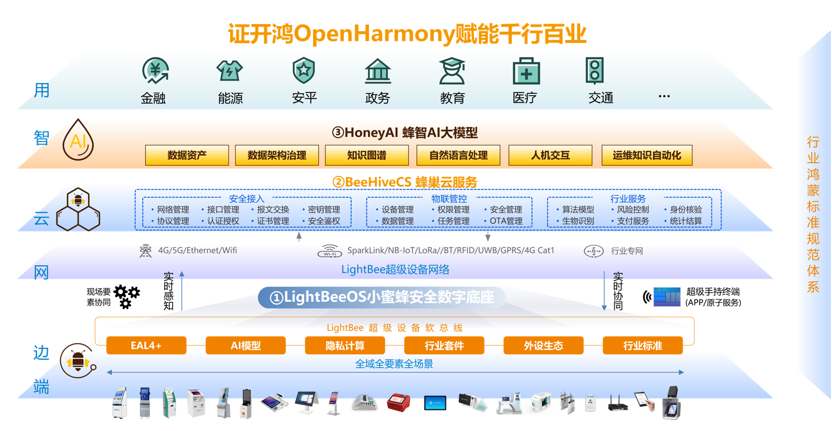 證開鴻作為開源鴻蒙生態(tài)的推動者及鴻蒙生態(tài)服務公司的重要合作伙伴,依托LightBeeOs操作系統(tǒng)\BeeHiveCS蜂巢云服務\HoneyAI蜂智AI大模型,構建一個完整的智能生態(tài)系統(tǒng),為用戶打造“端、邊、云、網、智、用”的全棧服務與解決方案。依托在金融行業(yè)的全產業(yè)鏈優(yōu)勢為用戶提供全場景全聯(lián)接、全流程、一體化的全棧式解決方案,實現(xiàn)以企業(yè)為主體、以場景為牽引、以標志性產品為抓手,踐行未來產業(yè)創(chuàng)新發(fā)展目標的實施,推動數(shù)字化發(fā)展全面升級。
